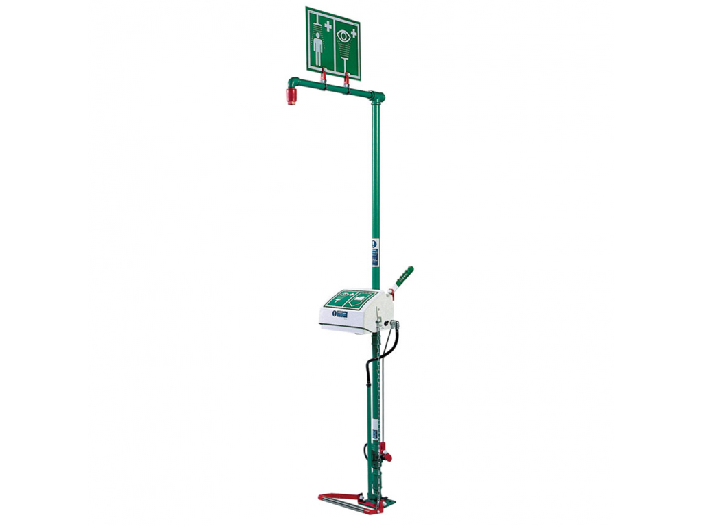 Fűtetlen mentesítő zuhany szem-, arcmosó kúttal. Alsó vízvezeték csatlakozással. Megjegyzés: A kút bármelyik irányba felszerelhető a zuhanzóra. Külön rendelhető tartozék: piktogram és felfogókeret, műanyag vagy rozsdamentes acélból zuhanyrózsa, triflex kézi zuhany, pedál a szemmosóhoz, világítás, foglaltság jelző kapcsoló, kabin. Bejövő vízvezeték csatlakozás: 1 1/4 colos belső mentes Minimális nyomás: 2 bar (kg/cm2)