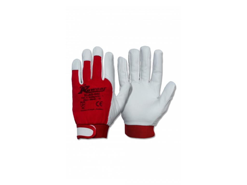 Szín sertésbőr kesztyű, piros gumírozott textil kézháttal, különösen alkalmas kéziszerszámokkal végzett feladatokra. 8-9-10 méretben