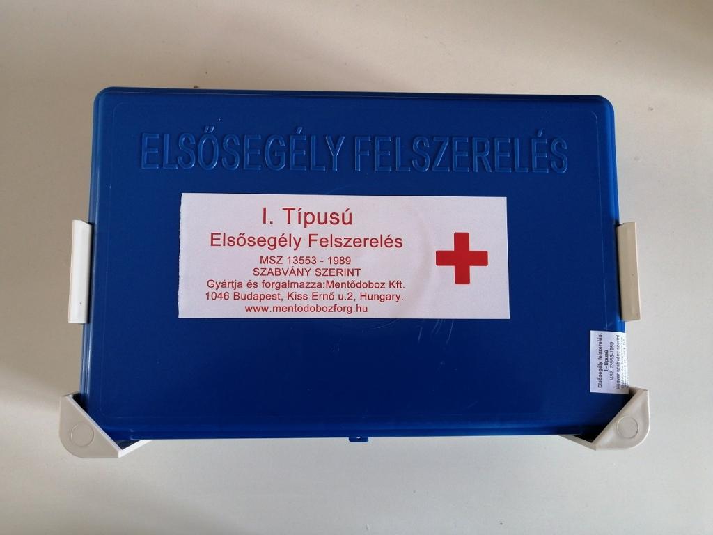 Elsősegély doboz a jogszabályban előírt tartalommal. Munkahelyi elsősegélyként a falra is szerelhető kivitelben. I.30 főig.