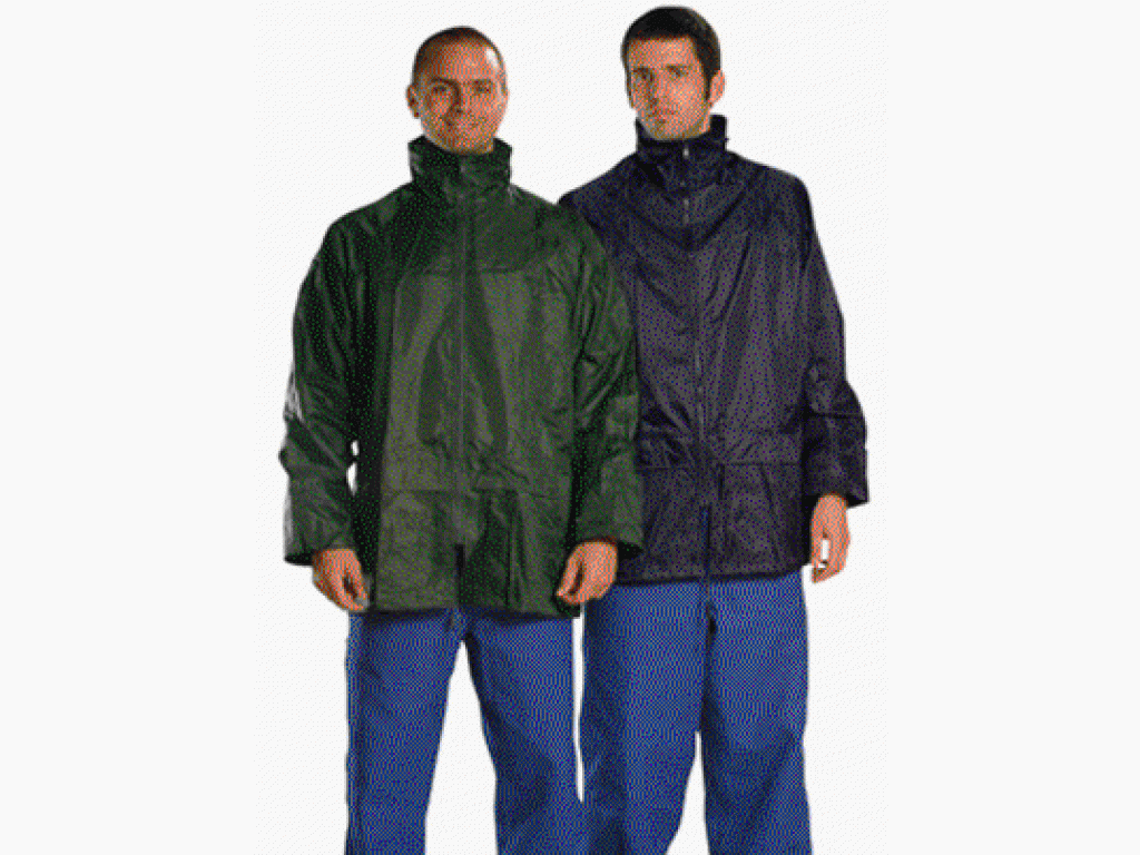 Orkán anyagból készült varrott és hegesztett vízhatlan esőköpeny kék és zöld színben rejtett kapucnival.