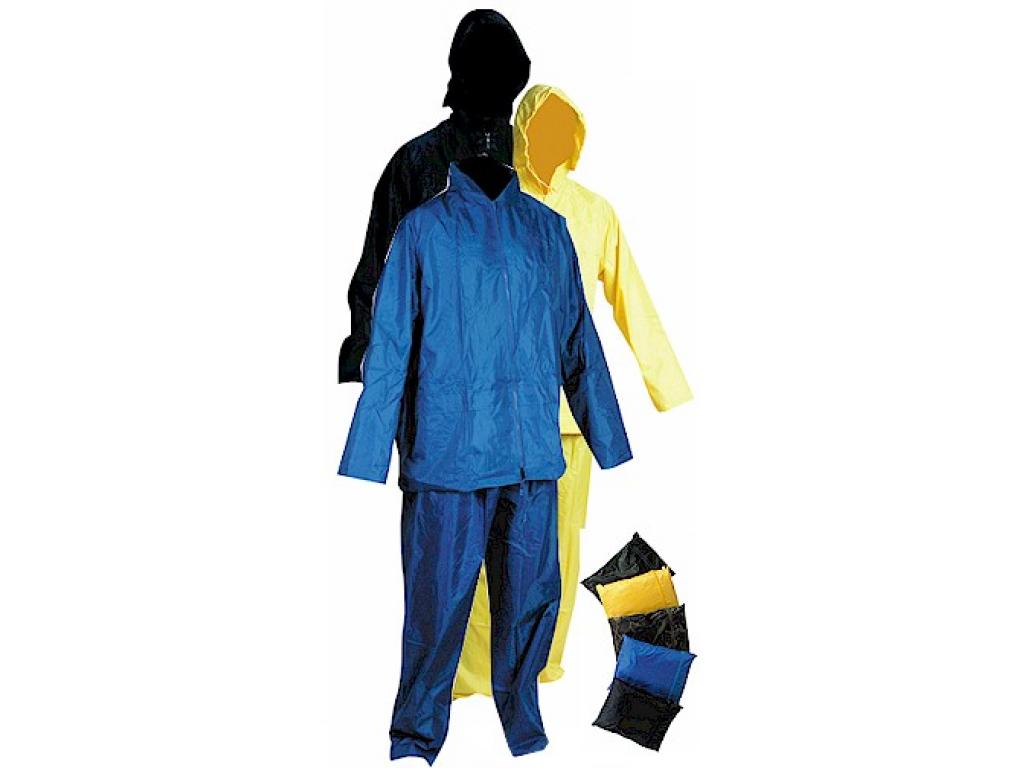Poliészter anyagra két oldalán PVC-vel kent esőruha, kapucnival, villámzárral és patenttal ellátott öltözék. Szín: sötétkék