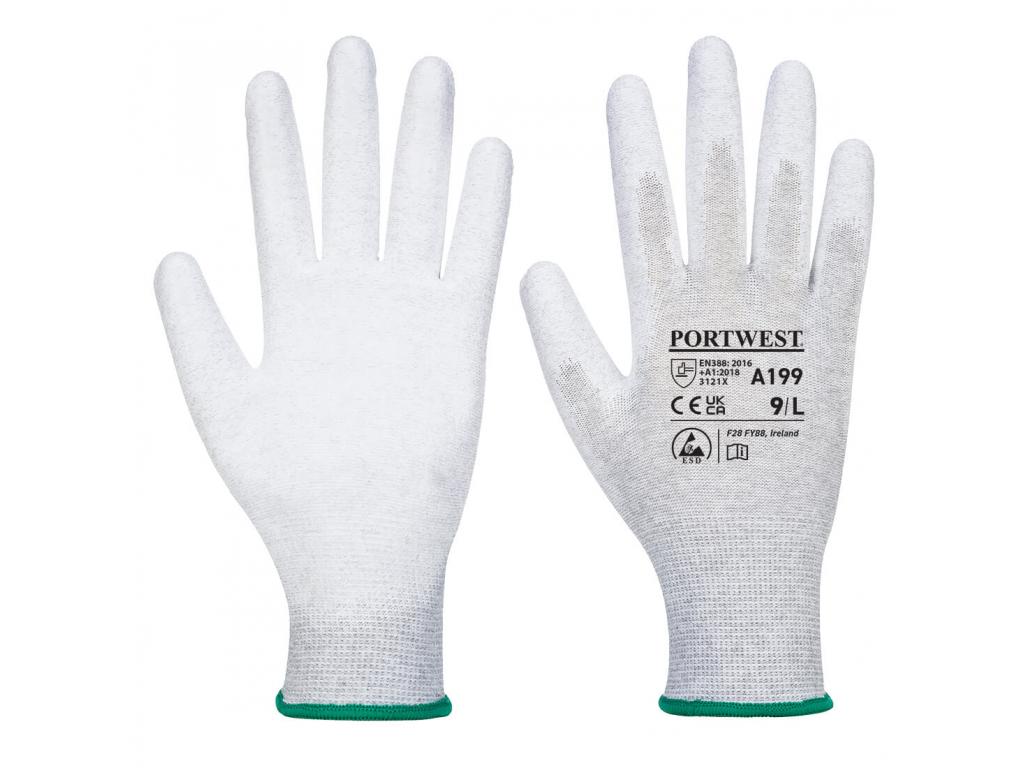 ESD típusú 13g nylon és szénszálból készülő, PU tenyérbevont precíziós védőkesztyű az elektronikai ipar számára. Nylon/Szénszál,PU Szín: szürke/fehér Méret: 7-10