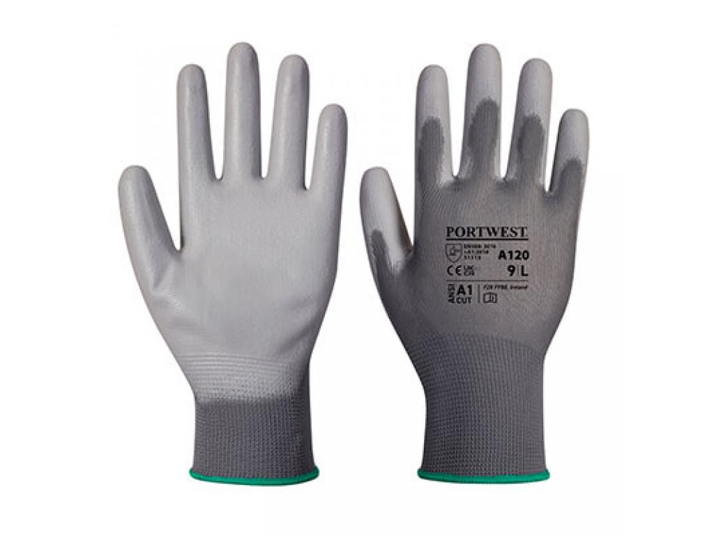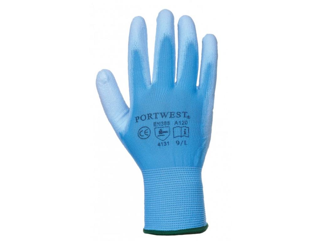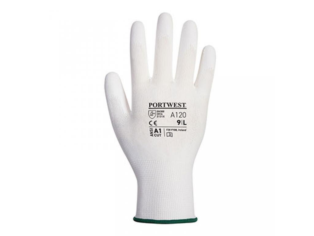Precíziós kesztyű, gumírozott mandzsetta, tenyéren poliuretánnal mártott. Fehér színű. EN 388 szabványnak felel meg
