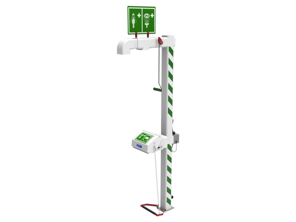 Mentesítő zuhany szem-, arcmosó kúttal, fűthető és szigetelt. Megrendelhető galvanizált vagy rozsdamentes acélból. Külön rendelhető tartozék: piktogram és felfogó keret, lábpedál, világítás, világító egység, foglaltság jelző kapcsoló, földalatti hosszabító vezeték. Bejövő vízvezeték csatlakozás: 1 1/4 colos külső mentes Minimális nyomás: 2 bar (kg/cm2)