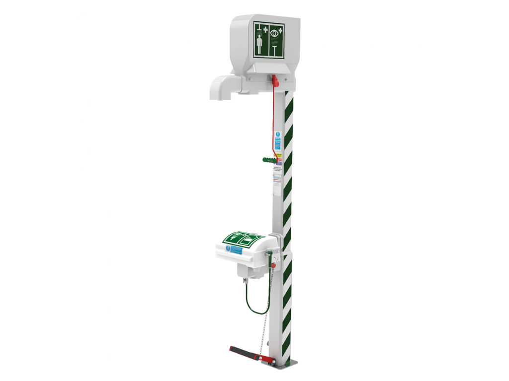 STD-MH-15K/11K tipusú időjárás és mechanikai behatások ellen jól ellenálló polietilén bevonatú szigetelt és fűtött vészzuhany szemmosó kúttal. A világító egység a piktogrammot és a zuhany környezetét is bevilágítja. Rendelhető robbanásbiztos kivitelben, lábráccsal, foglaltságjelzővel és földalatti fűtött toldalékkal.