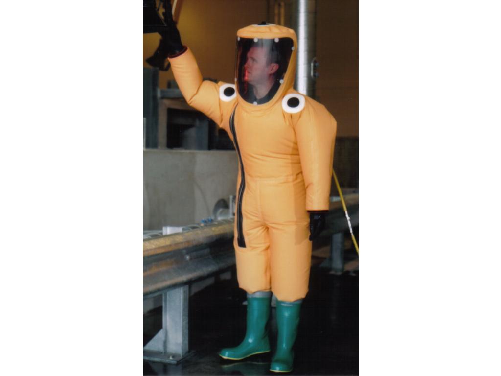 Túlnyomásos ipari védőruha, szennyezett légtérben végzett munkákhoz.
