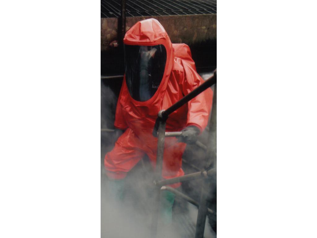 Viton-Butil-Viton anyagokból felépülő nehéz gázvédő ruha acélorrmerevítős és talplemezes védőcsizmával egybeépítve.