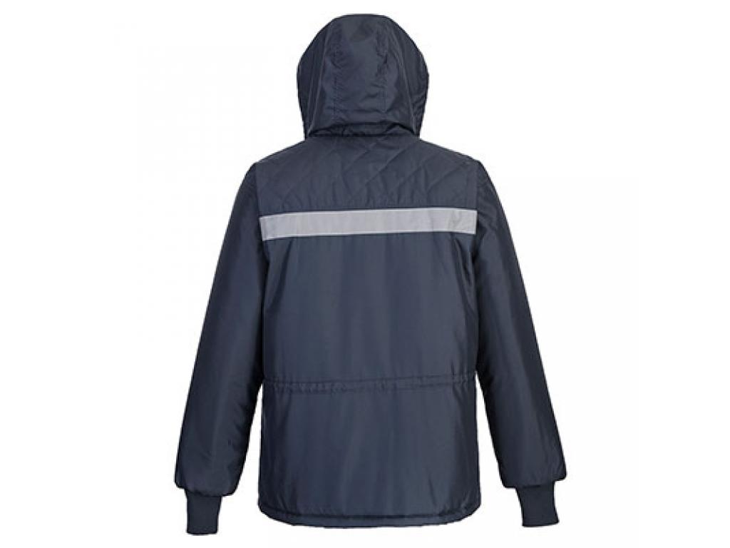 100% légáteresztő poliészter, fényvisszaverő csíkkal a válla közelében, rejtett tépőzár a kabát elején, sötétkék színű. Mínusz 40°C-ig véd. EN342. Méret:S-4XL